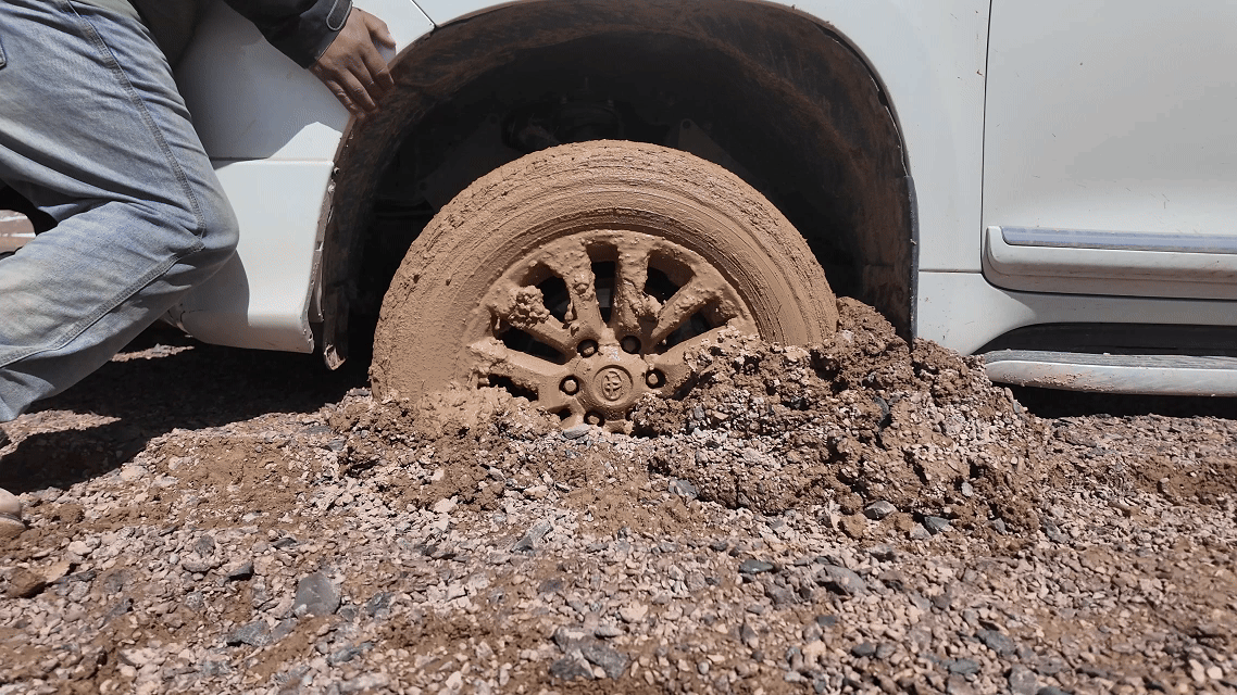 陷在濕軟泥地中的巡護(hù)車(chē)車(chē)胎。