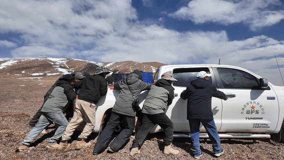 眼前這一幕仿佛預(yù)示著藏羚羊的遷徙之路和我們的巡護(hù)之路同樣艱難。再往前行駛不遠(yuǎn),車(chē)隊(duì)中的皮卡車(chē)肉眼可見(jiàn)在泥里越陷越深。