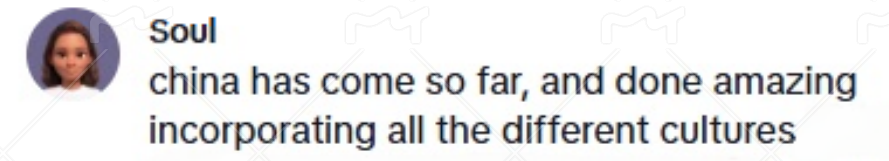 網(wǎng)友@Soul指出,“中國(guó)已經(jīng)取得了長(zhǎng)足的進(jìn)步,在融合各種不同文化方面做出了令人驚嘆的成就?!?/p>