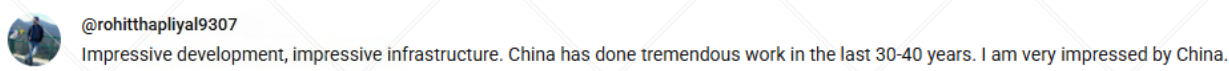 網(wǎng)友@rohitthapliyal9307說道,“多么令人矚目的發(fā)展,多么令人印象深刻的基礎(chǔ)設(shè)施。中國(guó)在過去三四十年里做出了巨大的貢獻(xiàn)。我對(duì)中國(guó)印象深刻?!?/p>