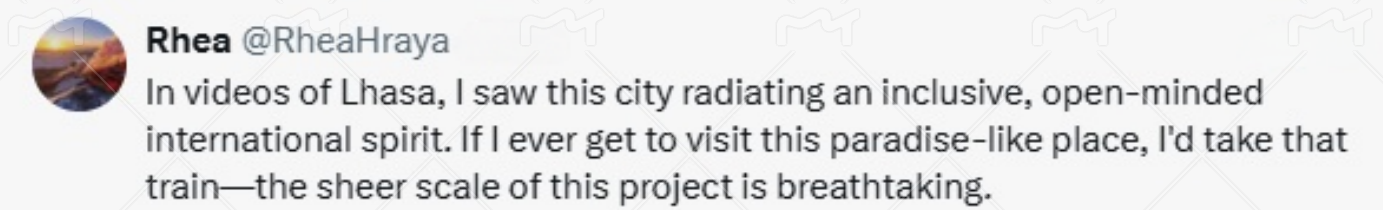 網(wǎng)友@Rhea表示,“在拉薩的視頻中,我看到這座城市散發(fā)著包容、開放的國(guó)際精神。如果我有機(jī)會(huì)參觀這個(gè)天堂般的地方,我會(huì)坐那列火車——這個(gè)項(xiàng)目(青藏鐵路)的規(guī)模令人嘆為觀止。”
