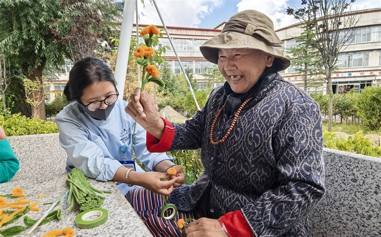 近日,記者走進拉薩市社會福利院的大門,一陣歡快的笑聲便撲面而來。循聲望去,涼亭下,幾位老人正圍坐在一起,手中拿著彩色毛線,在編織老師的耐心指導下專注地編織著花朵?!翱矗业幕ㄗ龊昧?!”卓嘎老人高高舉起剛剛完成的一朵黃色小花,孩子般興奮地向同伴們展示。她的手指雖有些顫抖,但眼神中卻掩飾不住自豪。另外一邊,幾位老人正在院子里悠閑地散步,一位護工正小心翼翼地攙扶著行動不便的老人,輕聲問道:“今天腿還疼嗎?要不要去理療室做做按摩?”關切之情溢于言表。