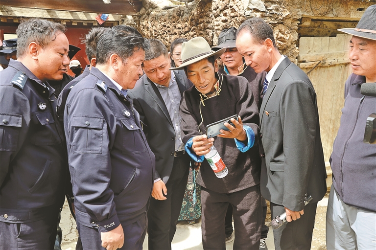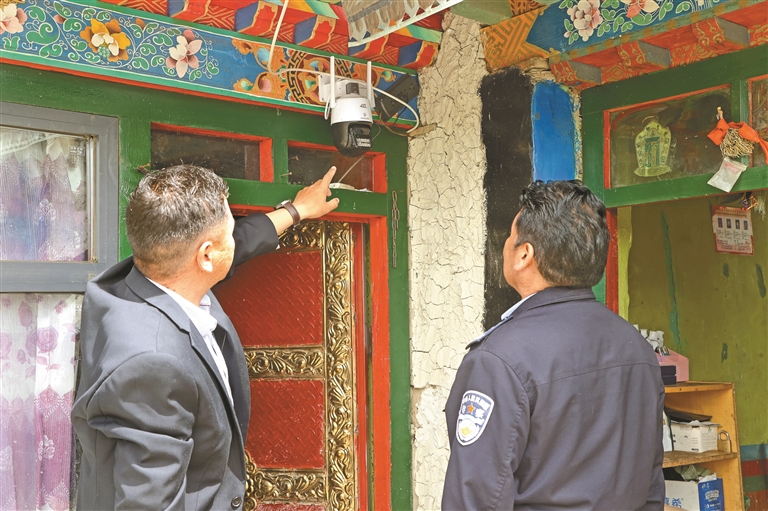 多卻鄉(xiāng)負(fù)責(zé)人與浪卡子縣公安局民警入戶了解家裝自衛(wèi)探頭運(yùn)行情況。