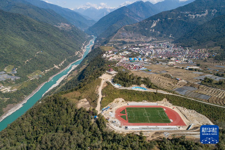 墨脫縣的11人制足球場位于雅魯藏布江邊(2021年2月13日攝,無人機(jī)照片)。新華社記者 孫非 攝