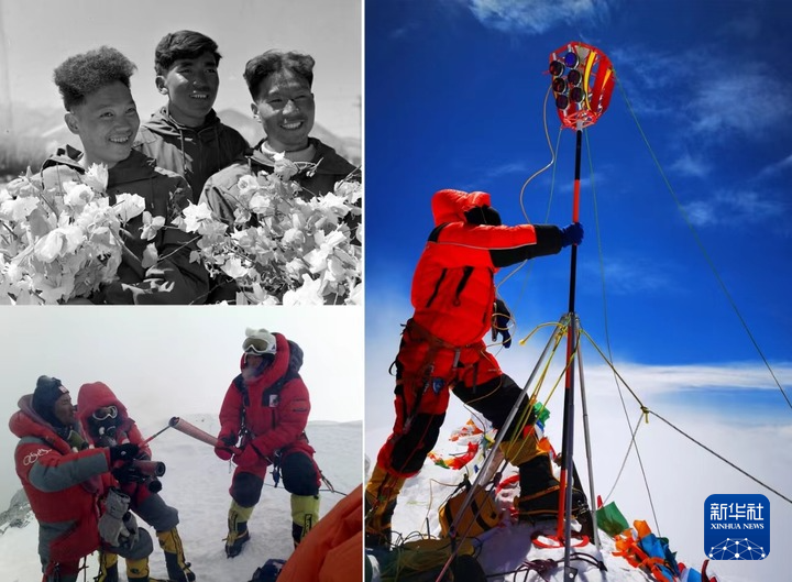 拼版照片:左上圖為1960年5月登上珠穆朗瑪峰峰頂?shù)闹袊巧疥?duì)隊(duì)員王富洲(右)、貢布(中)和屈銀華(資料照片,新華社發(fā));左下圖為2008年5月8日,北京奧運(yùn)圣火珠峰傳遞登山隊(duì)隊(duì)員羅布占堆(左)點(diǎn)燃第一棒火炬手吉吉手中的“祥云”火炬(新華社發(fā));右圖為2020珠峰高程測量登山隊(duì)隊(duì)員在珠穆朗瑪峰峰頂開展測量工作(2020年5月27日,新華社特約記者 扎西次仁 攝)