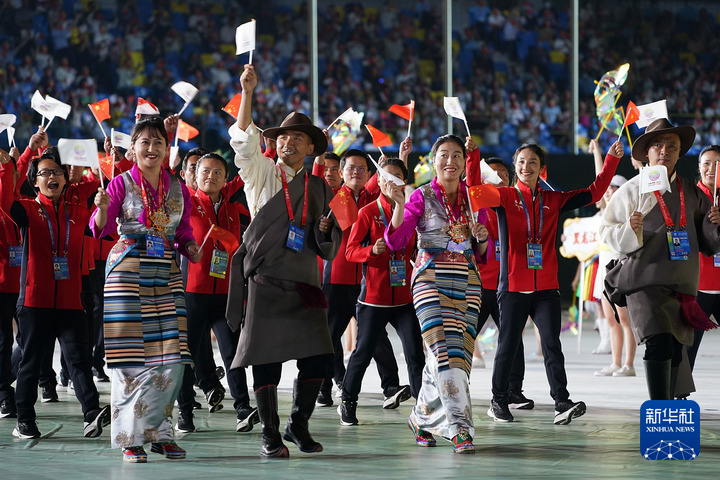 第十四屆全運(yùn)會開幕式,西藏自治區(qū)體育代表團(tuán)在入場儀式上(2021年9月15日攝)。新華社記者 彭子洋 攝
