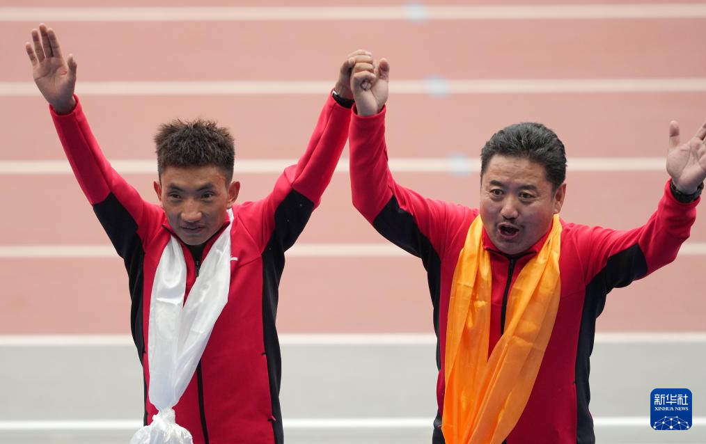 2021年9月23日,西藏隊(duì)選手多布杰(左)在第十四屆全運(yùn)會田徑項(xiàng)目上,以13分49秒16的成績奪得男子5000米冠軍。圖為他和教練員在頒獎儀式上。新華社記者 李一博 攝