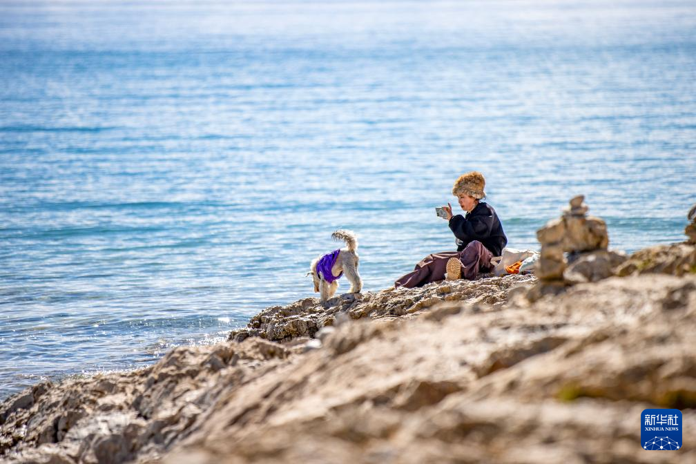 游客帶著寵物狗在納木錯湖邊拍照(9月16日攝)。新華社記者 姜帆 攝