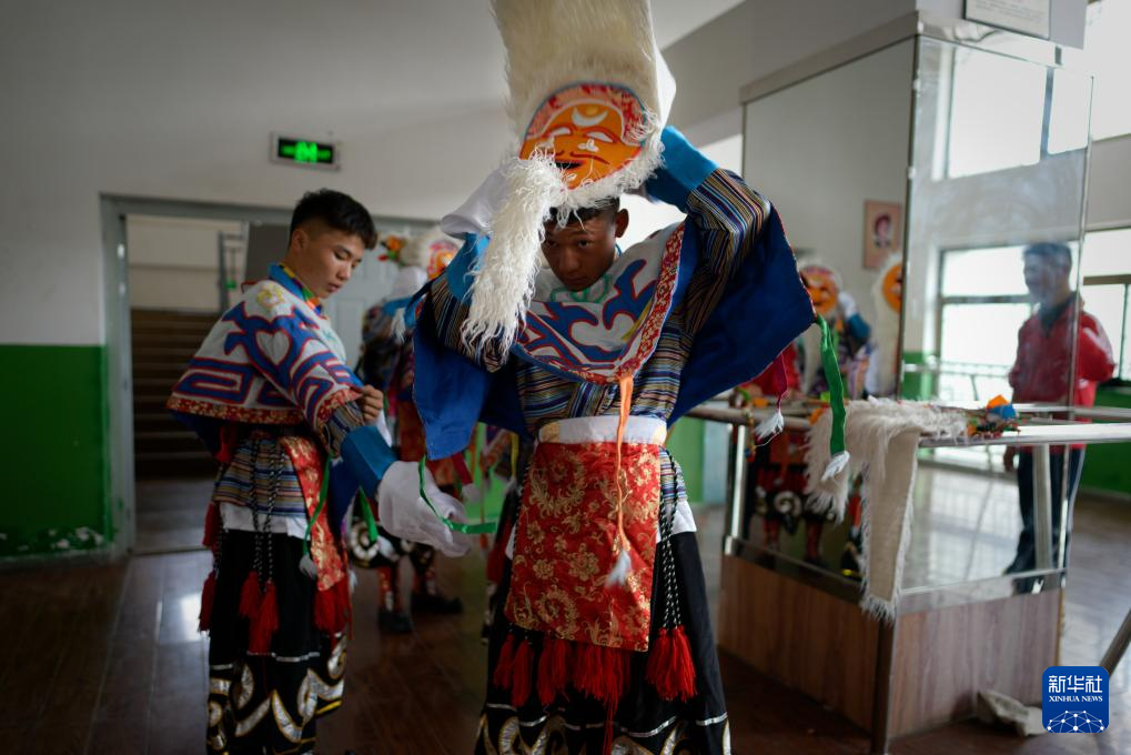 9月9日,在拉薩市第二中等職業(yè)技術(shù)學校,學生穿戴藏戲表演服飾。新華社記者 晉美多吉 攝