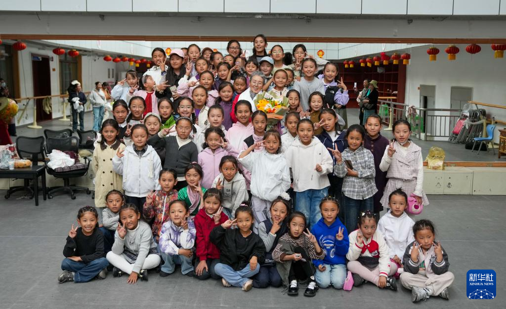 9月14日,在西藏自治區(qū)群藝館,巴桑老師和學習藏戲的孩子們合影留念。新華社記者 晉美多吉 攝