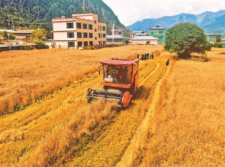 金秋的雪域高原,是一年中最動人的時節(jié)。蔚藍(lán)的天幕下,金色的青稞麥浪從山腳一直蔓延到云端。在隆隆的機(jī)械轟鳴與悠揚的勞作歌聲中,西藏各地農(nóng)區(qū)迎來了豐收的季節(jié)。