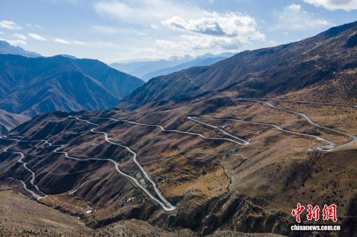 2023年1月16日,川藏公路西藏昌都段著名的“天路72拐”,該路段以高海拔、急彎、大落差等復(fù)雜驚險(xiǎn)路況被人熟知。(無人機(jī)畫面)中新社記者 江飛波 攝