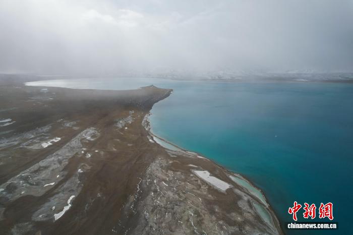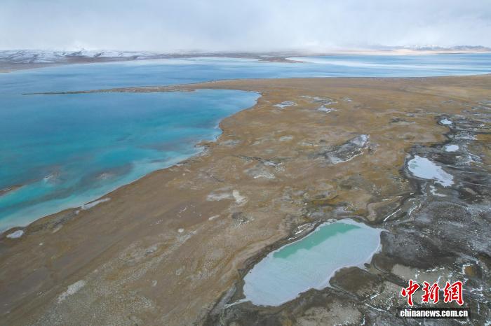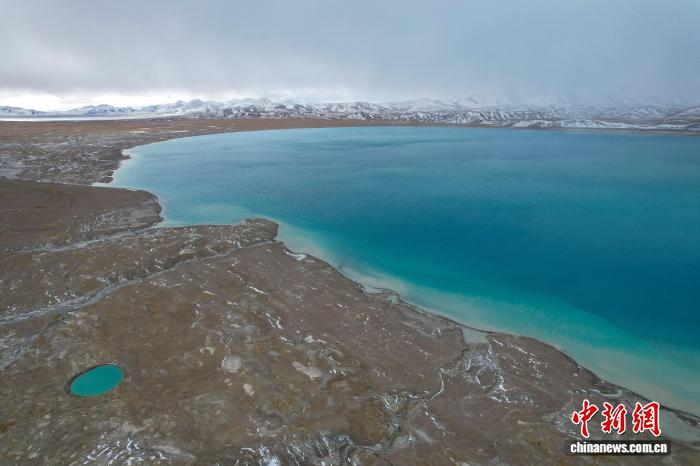 圖為10月9日,航拍視角下,美馬錯湖水顏色漸次變化,遠處雪山隱隱。江飛波 攝