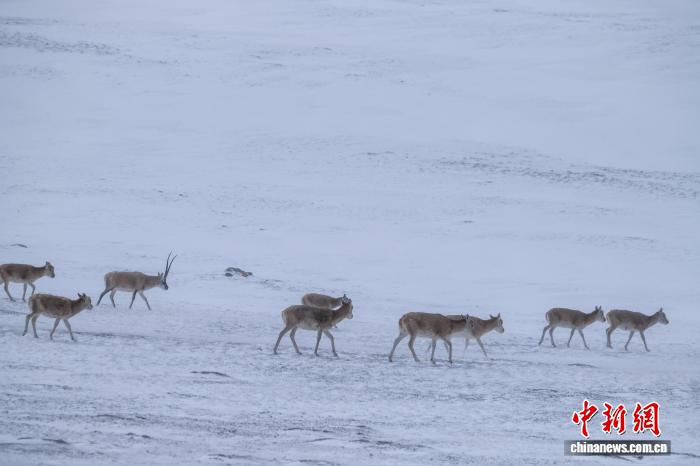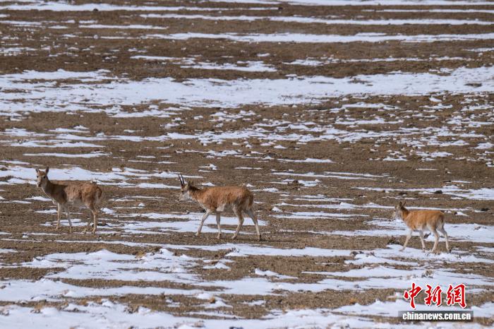 近日,中新網(wǎng)記者在西藏自治區(qū)阿里、那曲等地記錄到藏羚羊群活動(dòng)影像。畫面中,藏羚羊群或低頭覓食,或結(jié)伴而行,在高原的雪原與草原之間勾勒出和諧畫卷。據(jù)悉,近年來,西藏藏羚羊種群規(guī)模一直持續(xù)擴(kuò)大。2024年西藏自治區(qū)生態(tài)環(huán)境廳發(fā)布的《2023西藏自治區(qū)生態(tài)環(huán)境狀況公報(bào)》顯示,西藏境內(nèi)藏羚羊數(shù)量增長到30多萬只。圖為10月9日,在西藏阿里地區(qū)拍攝到的藏羚羊群。江飛波 攝