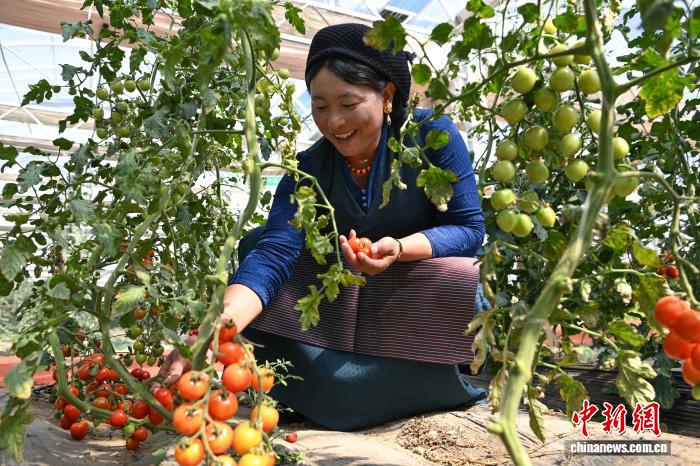 圖為當(dāng)?shù)毓と嗽谀窆たh現(xiàn)代化農(nóng)業(yè)示范園里采摘圣女果。中新社記者 貢嘎來(lái)松 攝