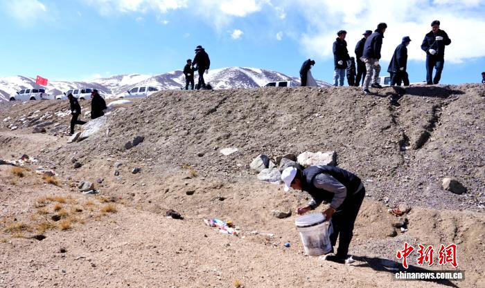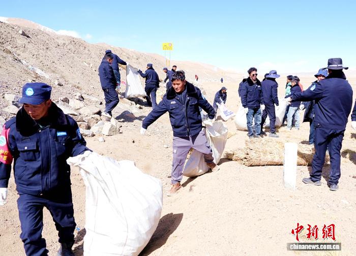 圖為參加專項(xiàng)清潔行動(dòng)的專業(yè)管護(hù)人員撿拾G216國(guó)道兩側(cè)垃圾。索朗仁青 供圖