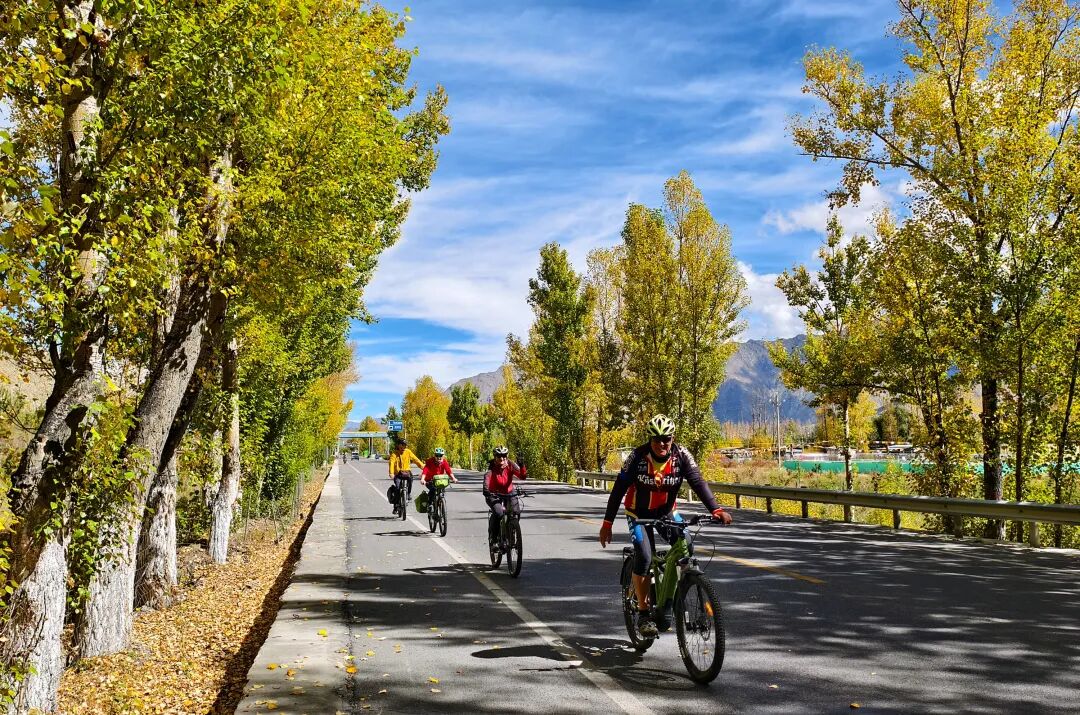 圖為自行車隊(duì)在拉薩市曲水縣秋意盎然的國(guó)道騎行。記者 次仁平措 攝