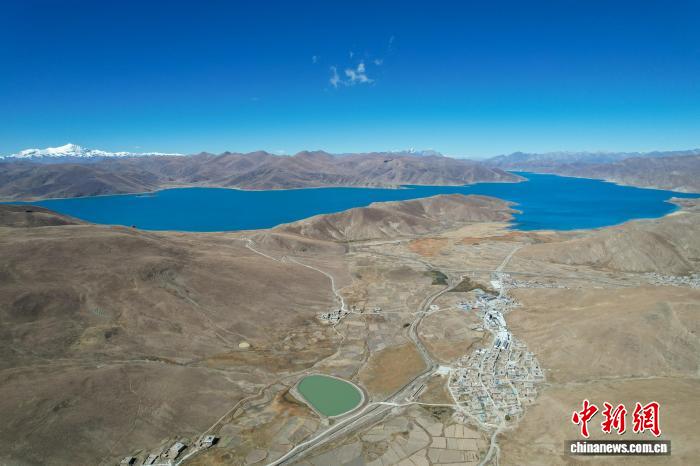 10月25日,西藏山南羊卓雍錯(cuò)東北岸東拉鄉(xiāng)沿線風(fēng)光,遠(yuǎn)處雪山皚皚。(無人機(jī)畫面)中新社記者 江飛波 攝