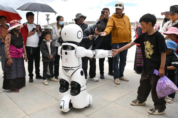2025年9月6日,在西藏那曲市恰青賽馬節(jié)現(xiàn)場,機器人的驚喜亮相,吸引前來觀賽的民眾與其互動。中新社記者 貢嘎來松 攝