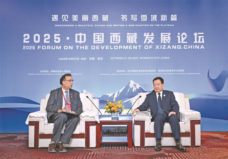 10月28日,自治區(qū)黨委書記王君正在林芝會(huì)見(jiàn)參加2025·中國(guó)西藏發(fā)展論壇的外國(guó)政要和駐華使節(jié)。這是王君正會(huì)見(jiàn)聯(lián)合國(guó)秘書長(zhǎng)古特雷斯先生的代表,聯(lián)合國(guó)教科文組織駐華代表、東亞辦事處主任兼代表夏澤翰。本報(bào)記者 旦增西旦 攝