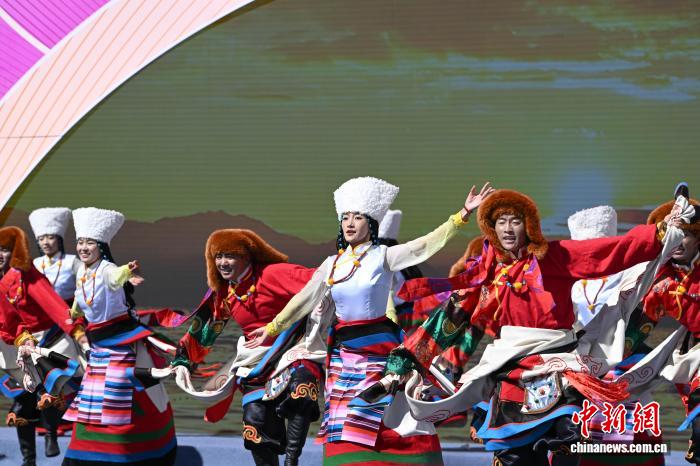 圖為阿里地區(qū)改則縣藝術(shù)團(tuán)表演舞蹈《歡舞幸?!じ膭t情》。中新社記者 貢嘎來松 攝