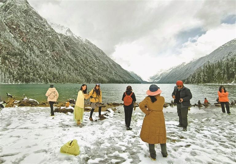 林芝市工布江達(dá)縣新錯(cuò)湖畔,游客在雪景中打卡留念,盡享高原湖光山色。記者 次仁平措 攝