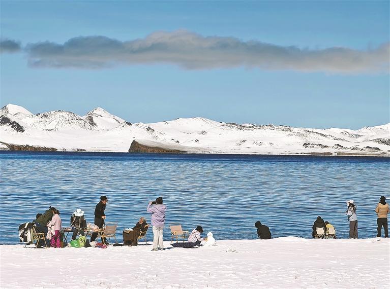 山南市普莫雍錯(cuò)湖畔,游客在雪域湖景中拍照,樂(lè)享高原冬日美景。記者 王敏 攝