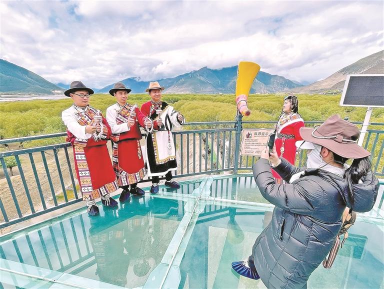 林芝尼洋河國(guó)家濕地公園旁,游客駐足合影,定格江河美景。 記者 次仁平措 攝