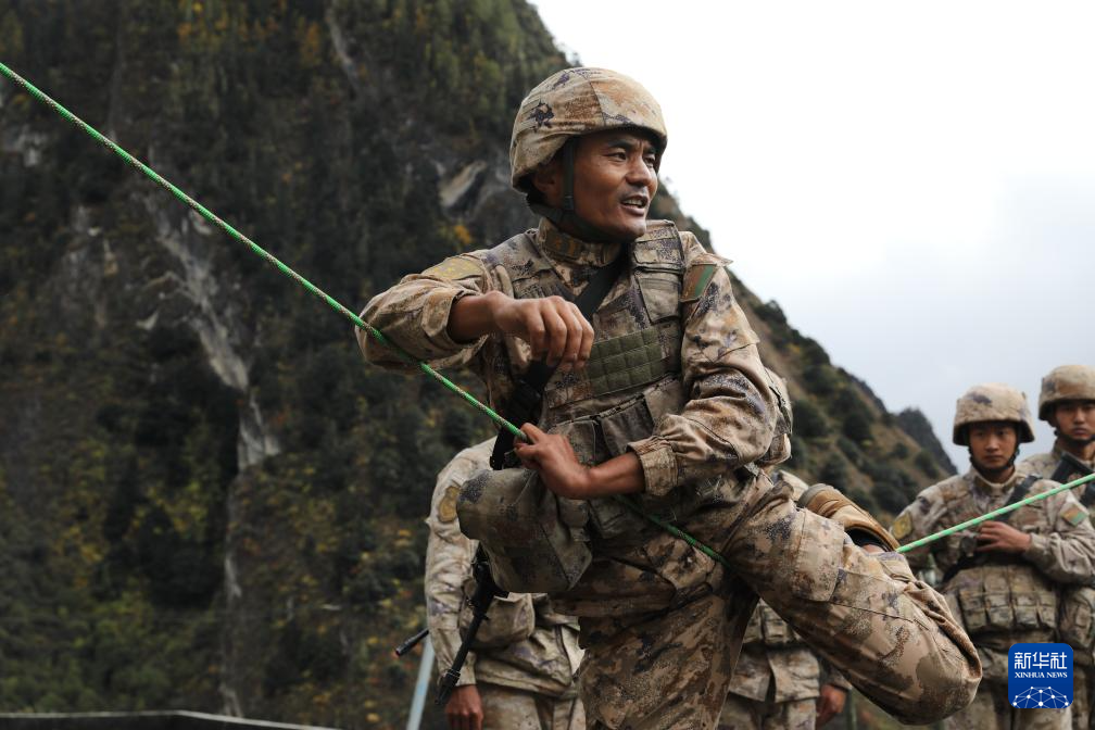 2025年11月1日,西藏軍區(qū)某團一級上士次羅布給戰(zhàn)友示范戰(zhàn)術動作。新華社發(fā)(于達 攝)