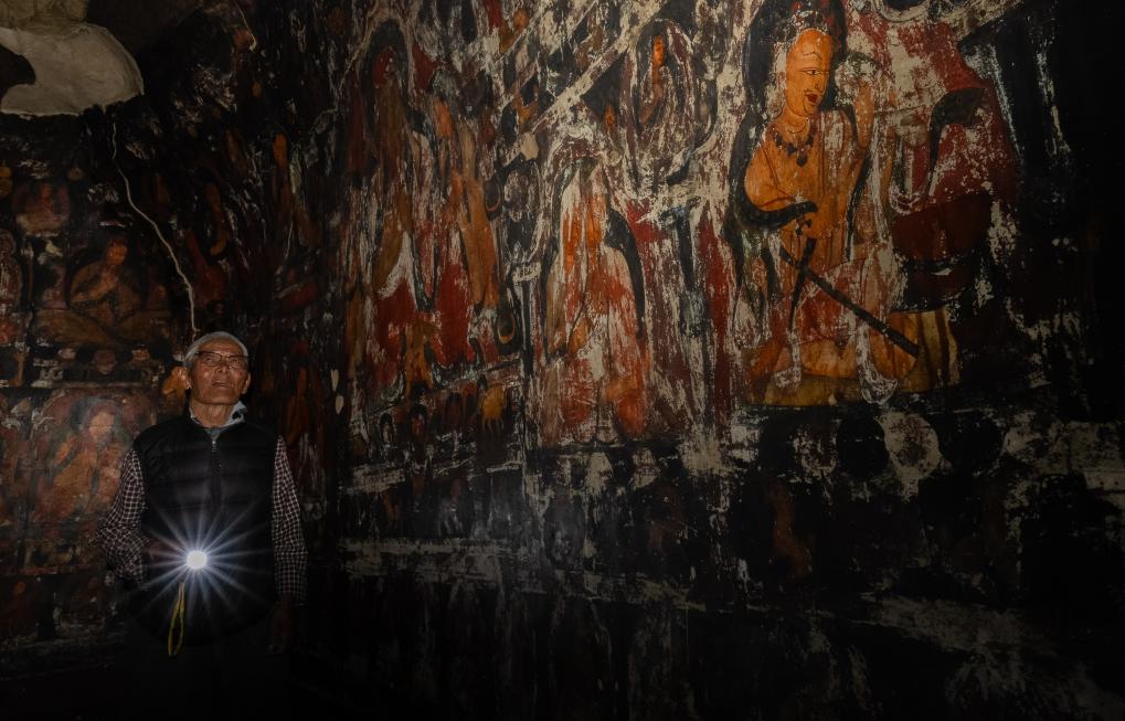 強(qiáng)巴次仁倚著洞口,聽著仁增旺扎的講解,瞇著眼望向那些畫。他看不太清壁畫的細(xì)節(jié)了,但半輩子的守護(hù),已讓壁畫像是他生活的一部分——也是他所理解世界的一部分。