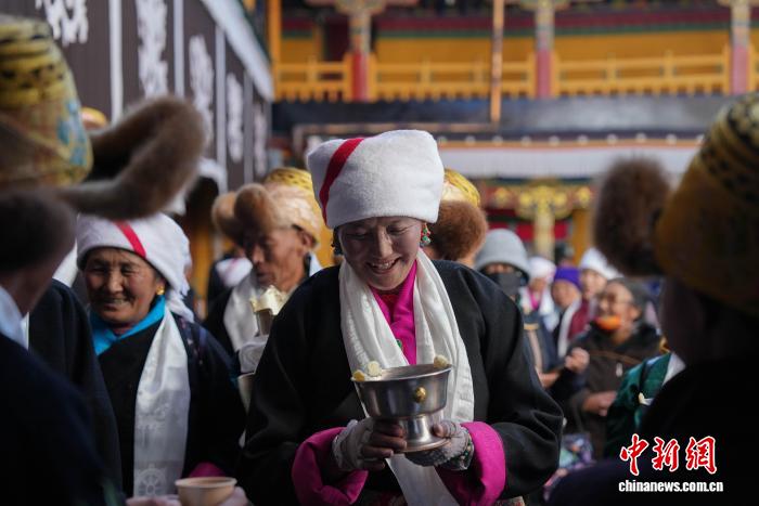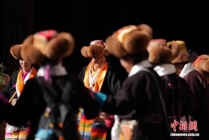 11月28日,隨著藏歷十月十五白拉姆節(jié)臨近,連日來,拉薩及周邊信眾身著色彩艷麗的藏裝節(jié)日盛裝,手持從家中精心準備的頭等青稞酒、新收的青稞及新鮮水果,陸續(xù)前往大昭寺、色拉寺、哲蚌寺等寺廟朝拜祈福。大昭寺內(nèi),信眾敬獻供品后載歌載舞,歌聲悠揚、舞步輕快,盡顯節(jié)日喜悅。白拉姆節(jié)又稱 “仙女節(jié)”。相傳,白拉姆是拉薩地區(qū)的保護神,是藏傳佛教最高護法神之一班丹拉姆的女兒。白拉姆曾與大昭寺護法神赤尊贊相互愛慕并私定終身,其母親班丹拉姆發(fā)現(xiàn)后,赤尊贊被趕到拉薩河南岸,每逢藏歷十月十五日,二人才能隔河相見一次。圖為白拉姆節(jié)臨近之際,信眾在大昭寺內(nèi)敬獻供品后載歌載舞的場景。貢確 攝