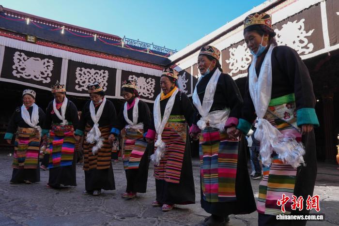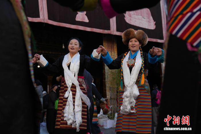 圖為白拉姆節(jié)臨近之際,信眾在大昭寺內(nèi)敬獻供品后載歌載舞的場景。貢確 攝