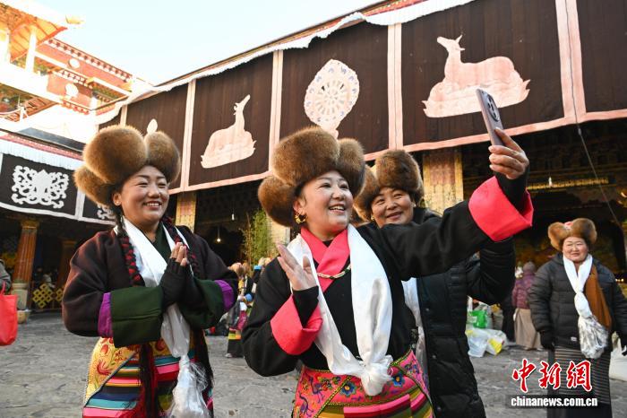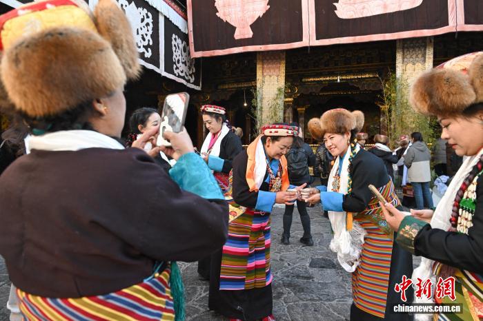 隨著藏歷十月十五白拉姆節(jié)(又稱(chēng)“仙女節(jié)”)臨近,11月28日,西藏拉薩的婦女們?cè)诖笳阉绿陚鹘y(tǒng)舞蹈后自拍留念,迎接“仙女節(jié)”到來(lái)?!跋膳?jié)”即吉祥天母節(jié),藏語(yǔ)稱(chēng)“白來(lái)日追”。相傳藏傳佛教最高護(hù)法神之一班丹拉姆的女兒白拉姆,不顧母親的反對(duì)與赤尊贊私定終身,班丹拉姆一怒之下將赤尊贊趕到拉薩河南岸,規(guī)定二人僅每年的藏歷十月十五日相見(jiàn)。中新社記者 貢嘎來(lái)松 攝