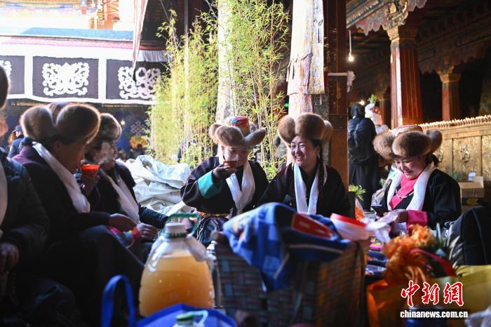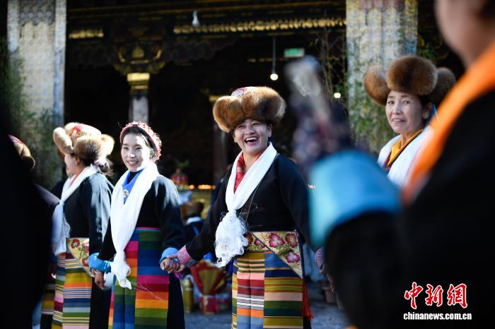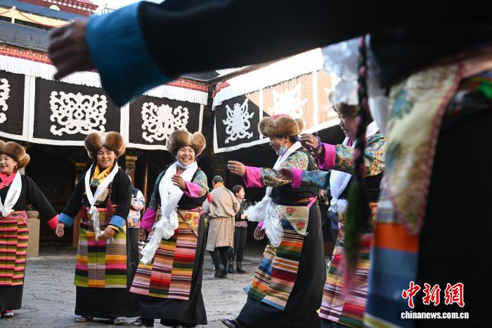 隨著藏歷十月十五白拉姆節(jié)(又稱(chēng)“仙女節(jié)”)臨近,11月28日,西藏拉薩的婦女們?cè)诖笳阉绿陚鹘y(tǒng)舞蹈后休息,迎接“仙女節(jié)”到來(lái)?!跋膳?jié)”即吉祥天母節(jié),藏語(yǔ)稱(chēng)“白來(lái)日追”。相傳藏傳佛教最高護(hù)法神之一班丹拉姆的女兒白拉姆,不顧母親的反對(duì)與赤尊贊私定終身,班丹拉姆一怒之下將赤尊贊趕到拉薩河南岸,規(guī)定二人僅每年的藏歷十月十五日相見(jiàn)。中新社記者 貢嘎來(lái)松 攝