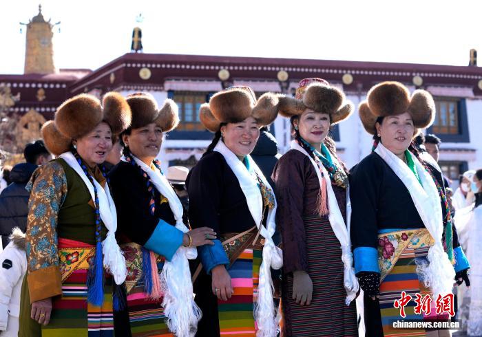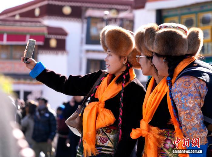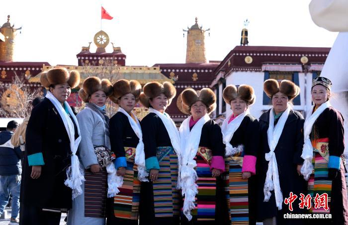 12月1日,西藏拉薩的婦女們盛裝來到拉薩大昭寺廣場,迎接“仙女節(jié)”到來?!跋膳?jié)”即吉祥天母節(jié),藏語稱“白來日追”。圖為拉薩婦女盛裝在大昭寺廣場拍照。中新社記者 李林 攝