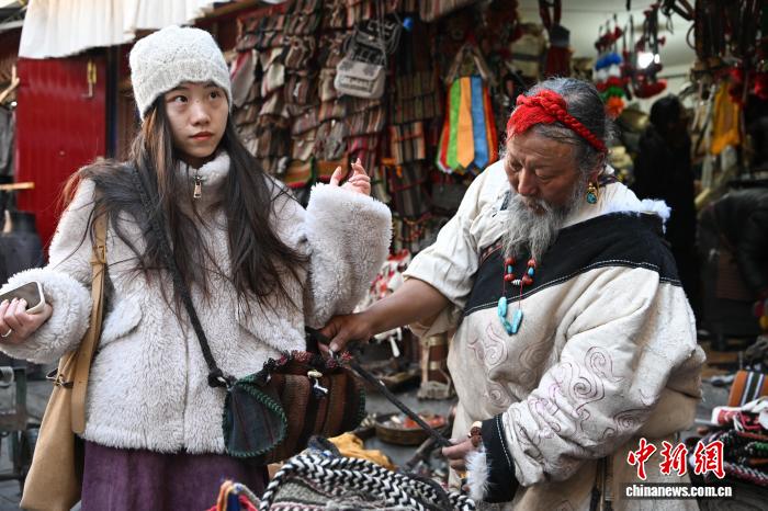 12月9日,西藏拉薩市八廓街沖賽康旁的背陰巷口,55歲店主次仁羅布的藏式老物件小店熱鬧非凡。不足30平方米的空間里,烏朵、馬包、藏式氆氌側掛包等好物琳瑯滿目,既有時光沉淀的老物件,也有手藝人新制精品。小店吸引本地民眾、年輕人及游客紛紛選購,生意紅火。圖為游客選購藏式氆氌側掛包。中新社記者 貢嘎來松 攝