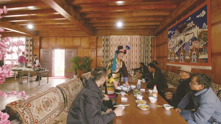 作為自治區(qū)級(jí)非遺傳承人、芒康縣“婦女致富帶頭人”的卓瑪拉姆,于2010年開(kāi)辦鹽井果拉叢農(nóng)家樂(lè),憑借著正宗的加加面風(fēng)味和熱情的服務(wù),逐漸積累了口碑。2012年,在各級(jí)政府的支持下,她采用“民族特色餐飲+鄉(xiāng)村旅游接待”的經(jīng)營(yíng)模式,生意日益紅火。2017年,通過(guò)貸款300萬(wàn)元、自籌160萬(wàn)元翻建了農(nóng)家樂(lè),將其升級(jí)為綜合型的民族特色餐飲店,經(jīng)營(yíng)規(guī)模大幅擴(kuò)大,最多時(shí)日接待游客達(dá)300余人。