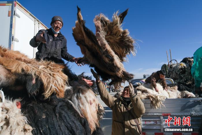 12月15日,西藏自治區(qū)那曲市第十八屆畜產(chǎn)品展銷會(huì)上,牧民在整理待售的羊皮。中新社記者 江飛波 攝