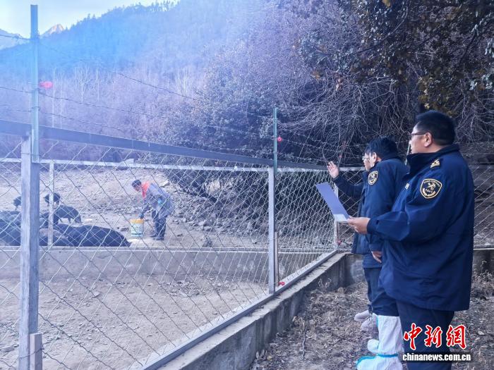 12月15日,拉薩海關(guān)所屬林芝海關(guān)關(guān)員對(duì)藏香豬養(yǎng)殖場(chǎng)進(jìn)行現(xiàn)場(chǎng)考核。拉薩海關(guān) 供圖