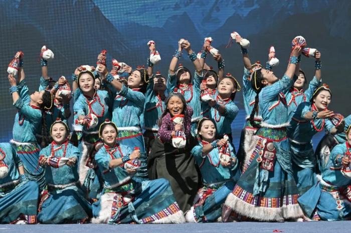 2025年11月2日,西藏自治區(qū)“大地歡歌 格?;ㄑ莩黾尽比珔^(qū)縣(區(qū))藝術(shù)團(tuán)惠民演出活動在拉薩市堆龍德慶區(qū)民族團(tuán)結(jié)主題公園上演。圖為昌都市邊壩縣藝術(shù)團(tuán)表演女子群舞《糌粑揉出幸福情》。中新社記者 貢嘎來松 攝