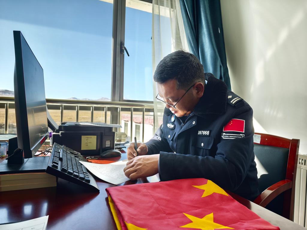 普瑪江塘邊境派出所所長(zhǎng)普布扎西為海南大學(xué)愛(ài)心藝術(shù)團(tuán)回信。(普瑪江塘邊境派出所供圖)