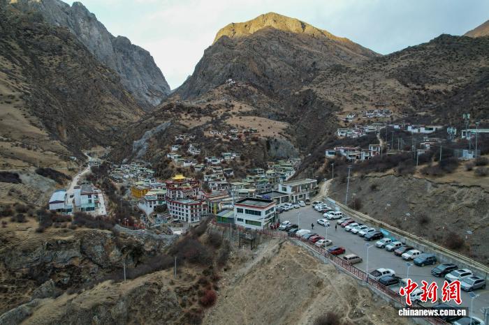 1月2日傍晚,拉薩市墨竹工卡縣德仲溫泉附近的停車場(chǎng)幾乎停滿了車輛。(無人機(jī)畫面)中新社記者 江飛波 攝