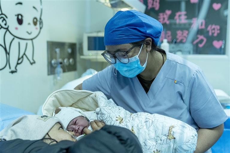 2026年1月1日,西藏自治區(qū)人民醫(yī)院婦產(chǎn)科助產(chǎn)醫(yī)生次拉(右)讓孩子母親旦增曲珍撫摸新生兒。 新華社記者 旦增尼瑪曲珠 攝