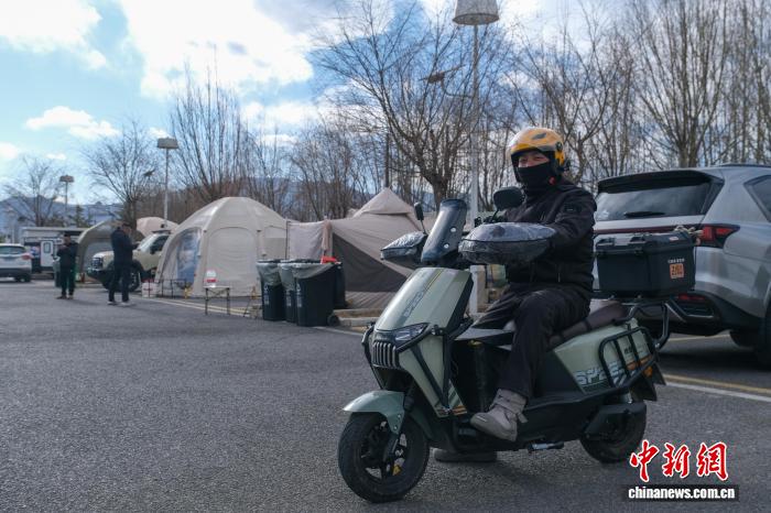 1月25日,拉薩市中華文化公園內(nèi),一位戶外露營(yíng)愛(ài)好者準(zhǔn)備出發(fā)去接單送外賣,該營(yíng)地不少人兼職當(dāng)外賣員,以支撐自己的戶外生活。江飛波 攝