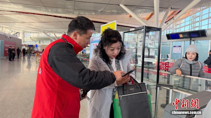 圖為在拉薩貢嘎國(guó)際機(jī)場(chǎng),志愿者協(xié)助游客解決乘機(jī)問(wèn)題。趙朗 攝