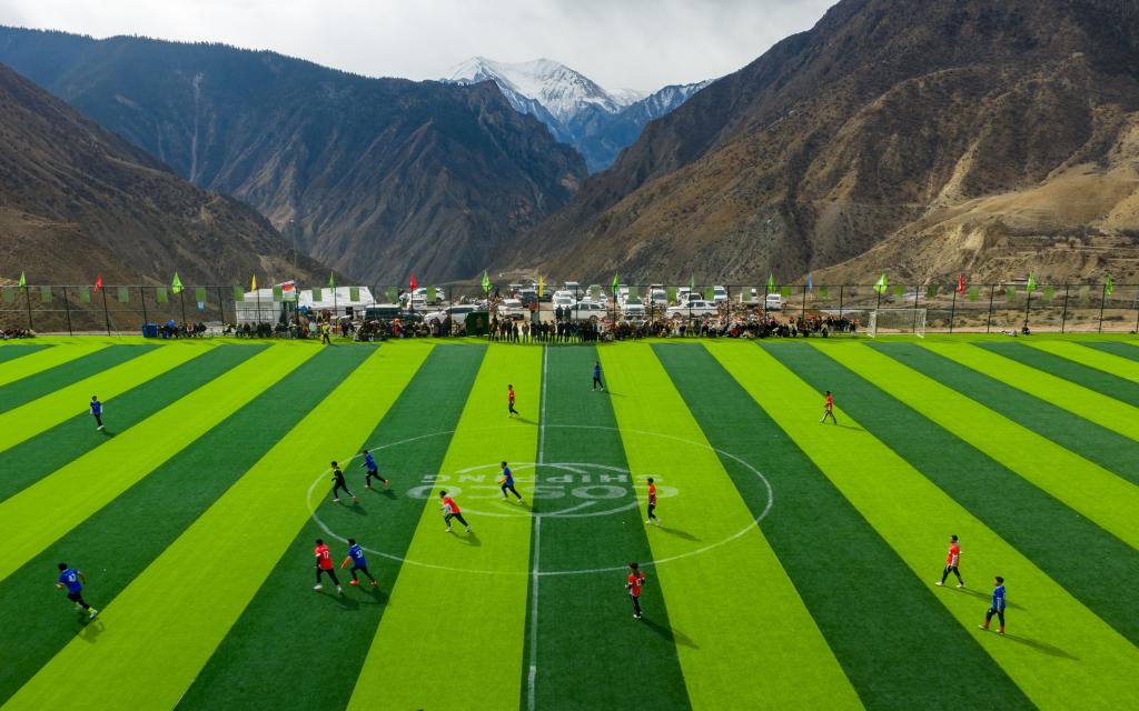夢想終有回響。2024年,洛隆縣與對口支援企業(yè)中國遠(yuǎn)洋海運(yùn)集團(tuán)一道在土球場附近,投資200余萬元建成一座占地8000余平方米的11人制標(biāo)準(zhǔn)足球場,當(dāng)年12月順利竣工,被當(dāng)?shù)厝擞H切喚作“云上球場”。
