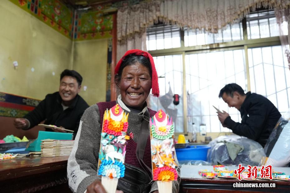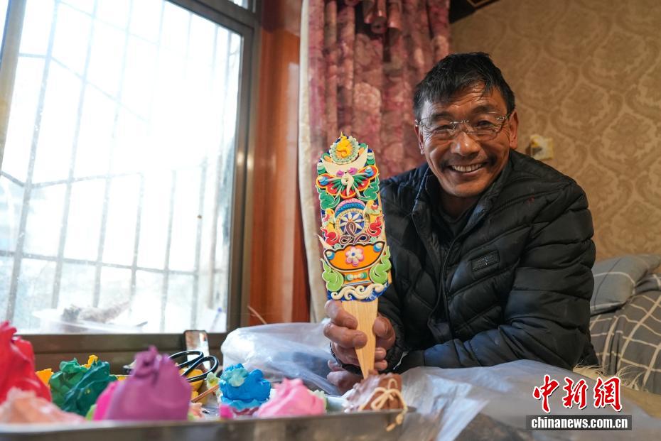 2月4日,隨著藏歷新年臨近,拉薩街頭年味漸濃,年貨市場上的“孜扎”迎來熱銷。酥油花藏語稱“孜扎”,是藏歷新年吉祥物切瑪盒的重要組件,也是藏族民眾家中必備的年貨。酥油花以酥油為主要原料,由匠人純手工捏制而成,造型涵蓋佛像、人物、花卉樹木、飛禽走獸等,常見圖案包含吉祥八寶、和諧四瑞、長壽圖等,承載著藏族民眾對新年平安吉祥、萬事順?biāo)斓拿篮闷碓?。圖為手工藝人展示制作完成的酥油花。貢確 攝