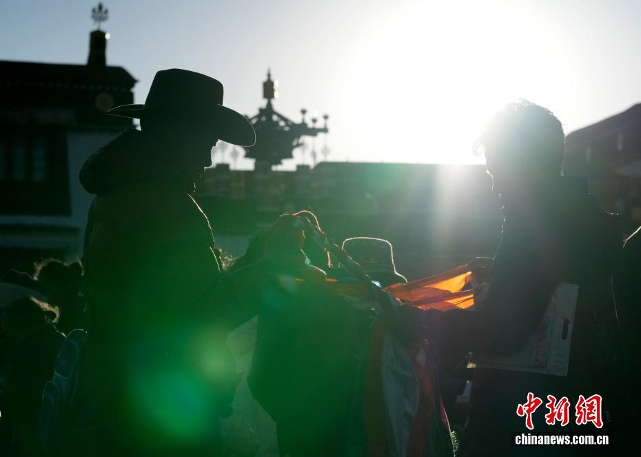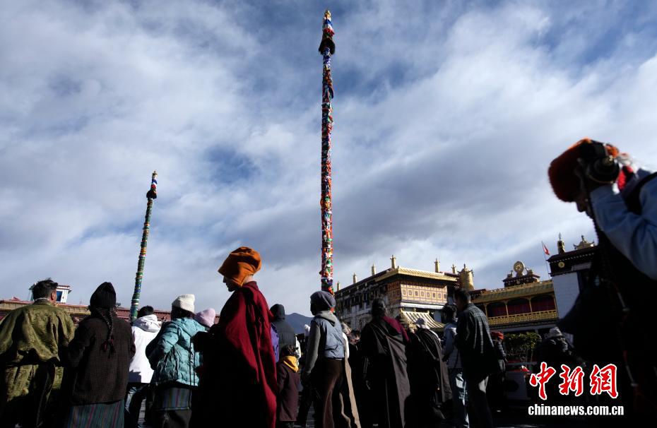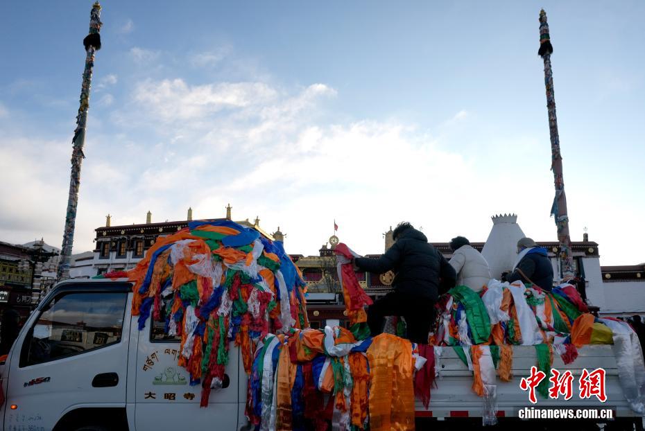 2月5日,西藏拉薩大昭寺的工作人員依據(jù)傳統(tǒng)為大昭寺周邊的5根高20多米的經(jīng)幡柱更換經(jīng)幡,迎接即將到來(lái)的藏歷新年。圖為信眾準(zhǔn)備五色哈達(dá)敬獻(xiàn)給經(jīng)幡柱。中新社記者 李林 攝