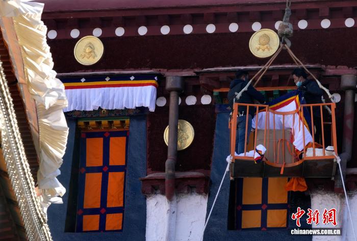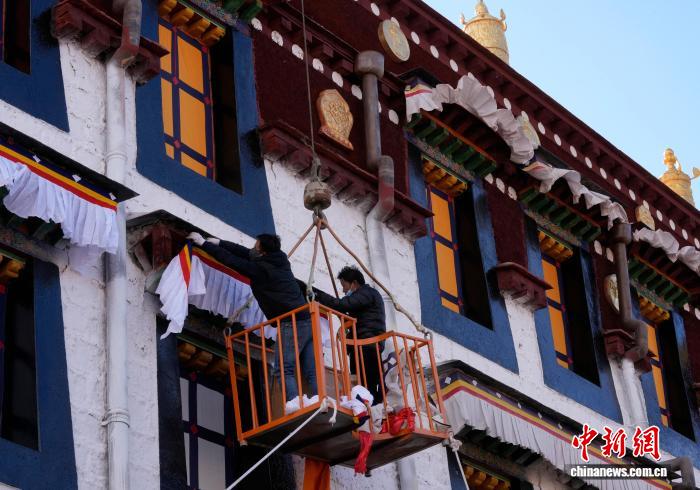 2月5日,西藏大昭寺更換“香布”,迎藏歷新年?!跋悴肌笔遣厥浇ㄖ难b飾,通常用五彩棉布縫制,主體為白色,搭配紅藍(lán)黃等色的邊沿,對窗沿等的顏料及木構(gòu)件起到保護(hù)作用。圖為工人們正乘坐吊車更換大昭寺“香布”。中新社記者 李林 攝