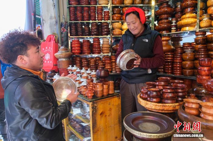 2月13日,拉薩年貨市場(chǎng),來(lái)自昌都市芒康縣的康巴漢子阿旺次仁(右)為顧客挑選藏式木碗。中新社記者 江飛波 攝